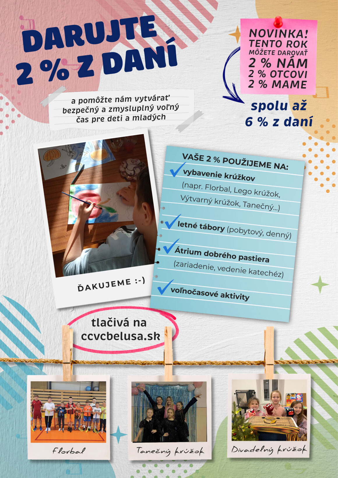obraciame sa na vás s prosbou o podporu Cirkevného centra voľného času v Beluši prostredníctvom darovania 2 % z vašich daní. Táto jednoduchá forma podpory vás nič nestojí, no má obrovský význam pre našu činnosť. Vaša pomoc nám umožní naďalej organizovať kvalitné podujatia, krúžky a aktivity nielen pre deti, ale aj mládež a dospelých.