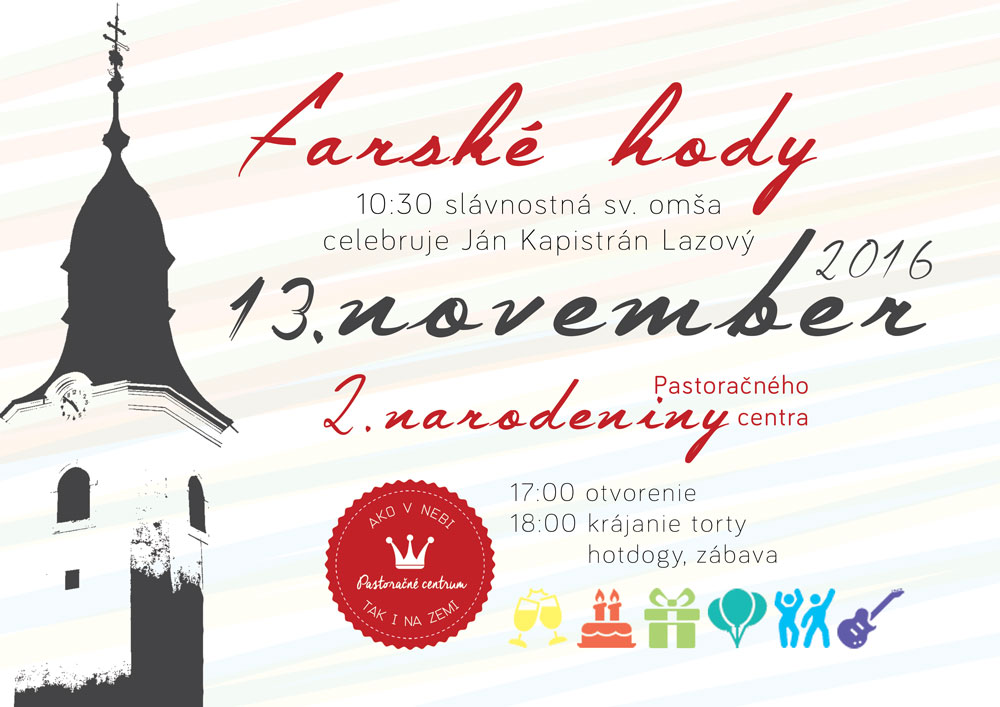 V rámci hodov budeme tiež oslavovať 2. narodeniny Pastoračného centra, ktoré bude otvorené od 17.00. O 18:00 je naplánovaný slávnostný prípitok a krájanie torty. Pozývame všetky deti, mládež, rodinky, ale aj starších.