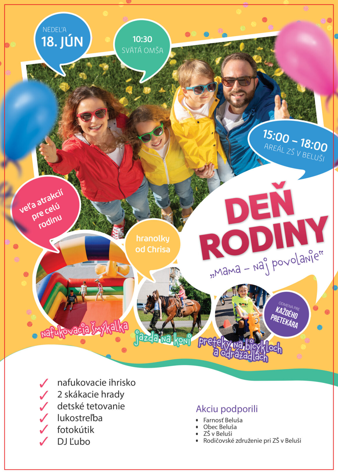 Budúcu nedeľu 18. júna sa bude konať Deň rodiny. Príďte s nami osláviť ďalší ročník tejto milej akcie, tentoraz s celoslovenským mottom „Mama – naj povolanie“. Už tradične začneme svätou omšou o 10:30, program pre rodiny bude v školskom areáli od 15:00 do 18:00. Tešiť sa môžete na obľúbené atrakcie: nafukovacia šmýkačka, skákacie hrady pre najmenších, lukostreľba, fotokútik, jazda na koni, maľovanie na tvár, súťaže na stanovištiach či preteky na bicykloch a odrážadlách. Nebude chýbať DJ Ľubo, stánok PC a hranolky od Chrisa.