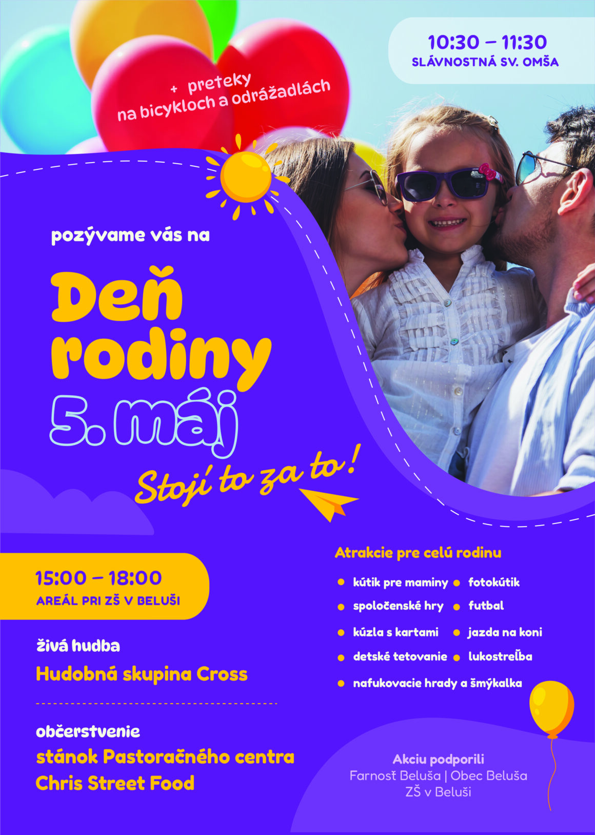 Srdečne pozývame všetkých na Deň rodiny s celoslovenským mottom „Stojí to za to!“, ktorý sa bude konať budúcu nedeľu 5. mája. Už tradične začneme sv. omšou o 10:30 vo farskom kostole, program pre rodiny bude v školskom areáli od 15:00 do 18:00. Tešiť sa môžete na obľúbené atrakcie pre deti, novinkou bude kútik pre mamy na dojčenie či prebaľovanie. Atmosféru nám spríjemní živá hudba – známe retrohity v podaní skupiny Cross zo Sverepca. Nebude chýbať stánok PC, burgre od Chrisa a trdelníky.