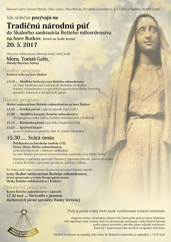 V sobotu popoludní o 15:30 bude na hore Butkov slávnostná sv. omša, ktorú bude sláviť náš diecézny biskup Tomáš. Sv. omši predchádza aj krížová cesta, ktorej začiatok je o 13:10 od chaty Muflónky. Autobusy sú zabezpečené. Na krížovú cestu odchádza iba od f. kostola o 12:45. Tí, ktorí pôjdu len na omšu, odchod autobusu je naplánovaný na 14:00 (2 autobusy od f. kostola, a po jednom z Hlože a Bel. Slatín so zástavkou aj v Podhorí o 14:15).