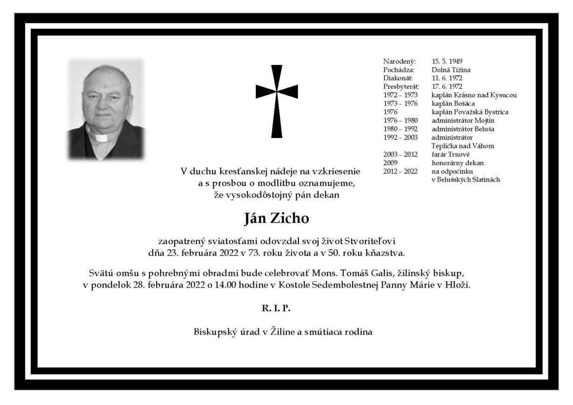 V duchu kresťanskej nádeje na vzkriesenie a s prosbou o modlitbu oznamujeme, že vysokodôstojný pán dekan Ján Zicho, zaopatrený sviatosťami, odovzdal svoj život Stvoriteľovi dňa 23. februára 2022 v 73. roku života a v 50. roku kňazstva.